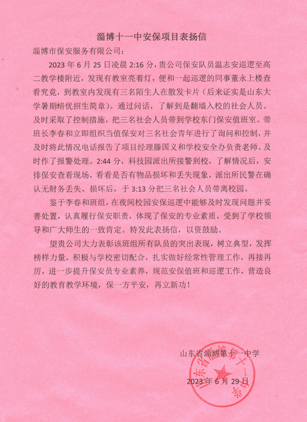 6月29日市保安公司駐淄博市第十一中學(xué)崗點(diǎn)收到學(xué)校送來(lái)的一封感謝信。信中對(duì)保安隊(duì)員溫志安、董永以及班長(zhǎng)李春和項(xiàng)目負(fù)責(zé)人滕國(guó)義提出表?yè)P(yáng)。6月25日凌晨2時(shí)16分,派駐淄博第十一中學(xué)保安隊(duì)員溫志安、董永巡邏至高二教學(xué)樓附近發(fā)現(xiàn)有三名陌生人在散發(fā)卡片(后來(lái)證實(shí)是山東大學(xué)暑期培優(yōu)招生簡(jiǎn)章)。通過(guò)問(wèn)話(huà),了解到是翻墻入校的社會(huì)人員,及時(shí)采取了控制措施,班長(zhǎng)李春和及時(shí)將此情況電話(huà)報(bào)告了項(xiàng)目負(fù)責(zé)人滕國(guó)義和學(xué)校安全辦負(fù)責(zé)老師,并及時(shí)作了報(bào)警處理。2時(shí)44分,科技園派出所接警到校,了解情況后,確認(rèn)無(wú)財(cái)物丟失、損壞后,于3時(shí)13分把三名社會(huì)人員帶離校園。為表彰先進(jìn)、弘揚(yáng)正氣,在保安隊(duì)伍中積極營(yíng)造干事創(chuàng)業(yè)、爭(zhēng)先創(chuàng)優(yōu)的良好氛圍,7月11日上午,對(duì)以上四名同志作出相對(duì)應(yīng)的現(xiàn)金獎(jiǎng)勵(lì),十一中校領(lǐng)導(dǎo)和公司項(xiàng)目負(fù)責(zé)人召開(kāi)專(zhuān)題會(huì)議共同為隊(duì)員進(jìn)行了表彰。“平凡崗位,點(diǎn)滴熱忱”李春和班組,在夜間校園安保巡邏中能夠及時(shí)發(fā)現(xiàn)問(wèn)題并妥善處置,認(rèn)真履行保安職責(zé),不僅體現(xiàn)了市保安公司保安隊(duì)員的專(zhuān)業(yè)素質(zhì),而且為其他保安隊(duì)員樹(shù)立了學(xué)習(xí)的榜樣。